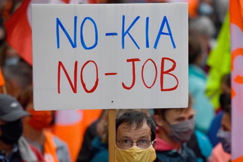 | Manifestation de salariés de Nokia à Lannion, en Bretagne, le 4 juillet. |