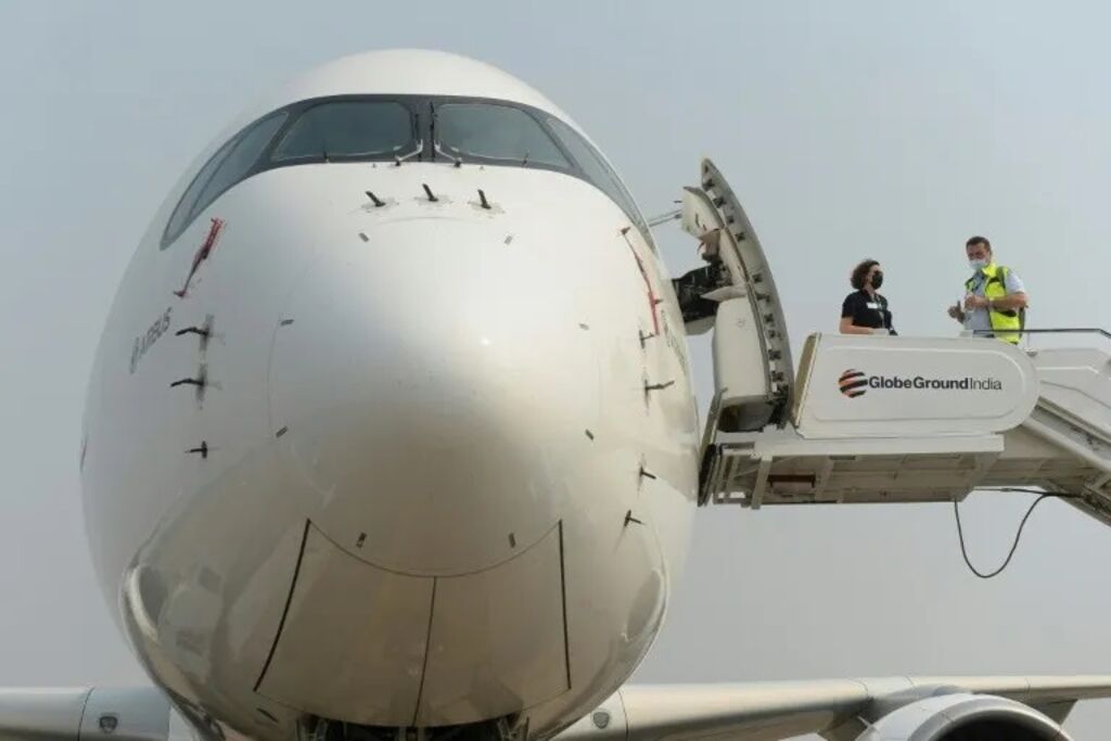 | Un Airbus A350 sur le tarmac de l'aéroport Begumpet à Hyderabad le 24 mars 2022. |