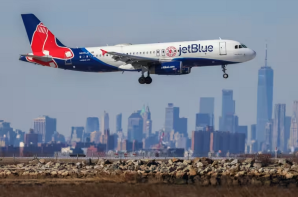 | Un Airbus A320 de la compagnie JetBlue en phase d'atterrissage à l'aéroport de New York, le 7 février 2024. |