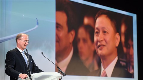 | Tom Enders, le patron d'Airbus, à l'occasion de la livraison du 10.000 appareil de l'avionneur européen, un A350-900 remis à Singapore Airlines, le 14 octobre, à Colomiers, près de Toulouse |