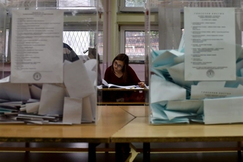 | Des membres de la Commission électorale serbe dans un bureau de vote de Belgrade, le 24 avril. |