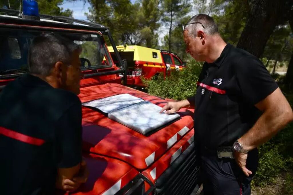 | Des pompiers regardent une carte du département des Bouches-du-Rhône à Marseille, à Gardanne dans le Sud de la France le 25 juillet 2023, alors que le département était en "alerte rouge", un risque élevé d'incendies de forêt. |