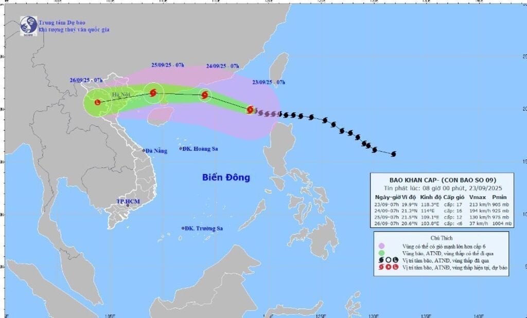 Selon Mai Van Khiêm, directeur du Centre national de prévisions hydrométéorologiques, à partir du 24 septembre, des vents violents de force 8 souffleront près du centre de la tempête, avec des rafales de niveaux 10-12 (102-118 km/h) et pouvant atteindre 15-16 (167-201 km/h).