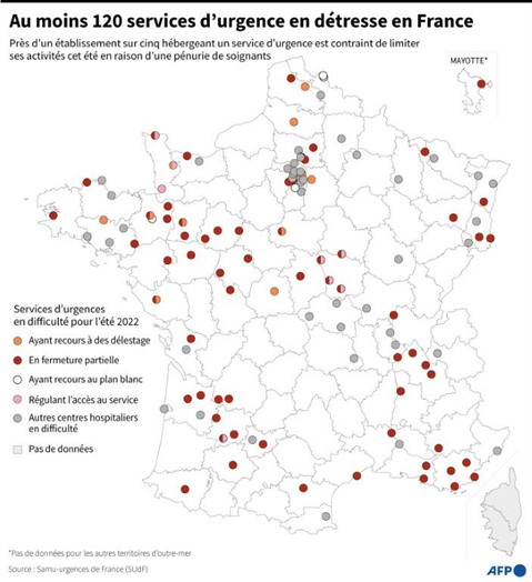 | Faute de soignants, au moins 120 services d'urgence ont été forcés de limiter leur activité ou s'y préparent, selon une liste établie par l'association Samu-Urgences de France. |