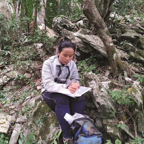 | Minh Nguyen prend des notes lors d’une sortie en forêt sur les traces du muntjac à grandes cornes. |