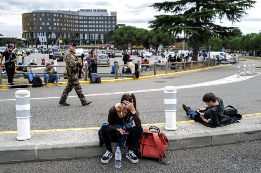 | Des voyageurs attendent à l'extérieur de l'aéroport de Toulouse-Blagnac évacué après une alerte à la bombe, le 18 octobre. |