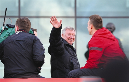 | Alex Ferguson (centre) vient au match, les commente et quand on ne lui demande pas son avis, il le donne quand même. |