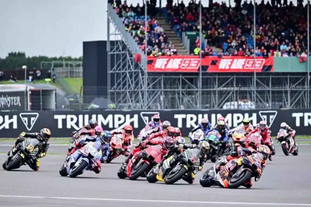 | Les pilotes de MotoGP lors du départ de la course sprint du Grand Prix d'Angleterre sur le circuit de Silverstone le 5 août. |