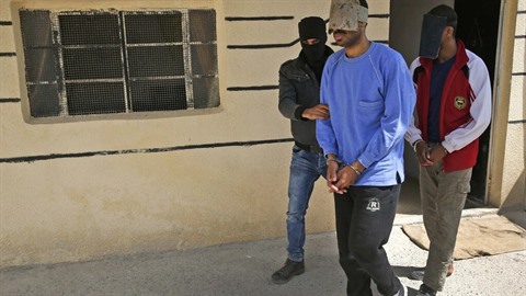 | Sur cette photo d'archive datée du 30 mars 2018, un agent de sécurité kurde escorte Alexanda Kotey (gauche) et El Shafee Elsheikh. |