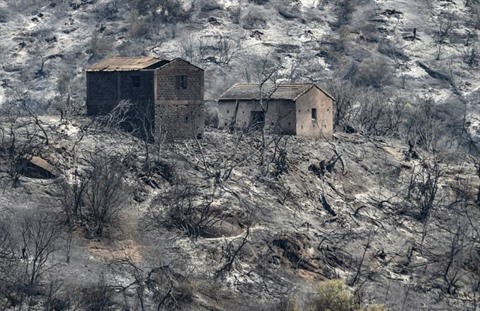 | Des maisons brûlées par des feux de forêt en Kabylie, à l'Est d'Alger, le 11 août. |