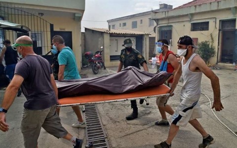 | Des hommes transportent le corps d'un homme lors d'incendies à Tizi Ouzou, dans le Nord de l'Algérie, le 10 août. |