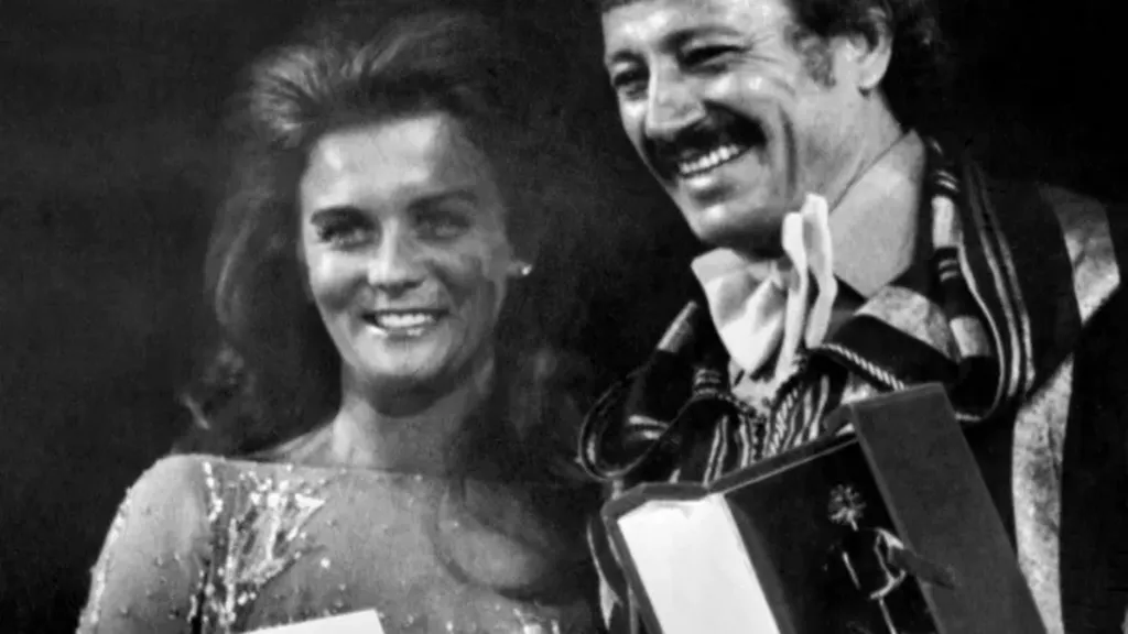 | Le réalisateur algérien Mohamed Lakhdar Hamina aux côtés de l'actrice américaine Ann Margret après avoir reçu la Palme d'or pour son film "Chronique des années de braise", lors de la cérémonie de clôture du 28e Festival de Cannes, le 24 mai 1975. |