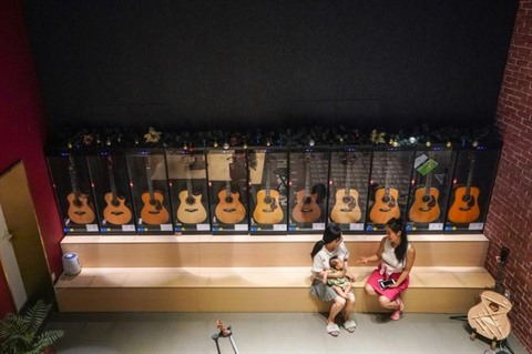 | Dans cette photo prise le 5 août, Wang Chao (à droite) et Chao Anya sont en conversation dans le magasins de guitares de la première à Shanghai. |