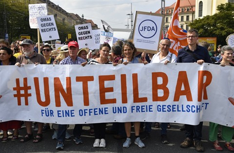 | Des milliers de personnes ont défilé le 24 août à Dresde pour protester contre le racisme et l'avancée de l'extrême droite en Allemagne |
