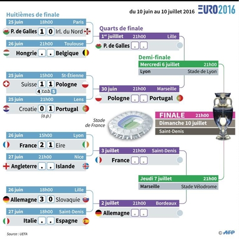 Après s'être fait une peur bleue contre l'Eire (2-1) à cause d'un penalty concédé très rapidement, la France sera opposée dimanche prochain 3 juillet soit à l'Angleterre soit à l'Islande, qui s'affrontent également ce lundi 27 juin.