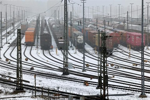 | La gare de triage de Maschen, au sud de Hambourg, en Allemagne, le 16 février 2021. |