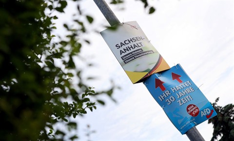 | Pancartes électorales de la CDU (en haut) et de l'AfD dans l'État régional de Saxe-Anhalt, à Heyrothsberge, près de Magdebourg, le 3 juin. |
