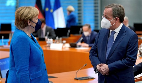 | La chancelière allemande Angela Merkel et Armin Laschet, le nouveau chef de son parti qui brigue sa succession, à Berlin, le 31 mai. |