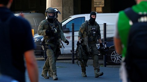 | Des policiers déployés à la gare principale de Cologne, en Allemagne après d'une prise d'otage. |