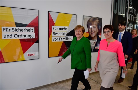 | La chancelière Angela Merkel (gauche) et le numéro deux de la CDU, Annegret Kramp-Karrenbauer. |