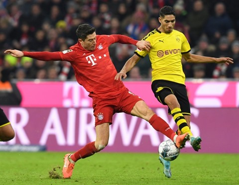 | Le buteur polonais du Bayern Robert Lewandowski (gauche) à la lutte avec le défenseur de Dortmund Achraf Hakimi, le 9 novembre à Munich. |