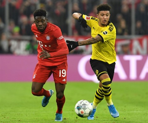 | Le milieu britannique de Dortmund Jardon Sancho (droite) à la lutte avec le milieu du Bayern Davies Alphonso, le 9 novembre à Munich. |