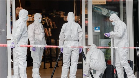 | Des inspecteurs de la police relèvent des indices après une attaque meurtrière au couteau, le 28 juillet à Hambourg, en Allemagne. |