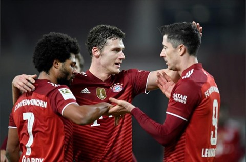 | L'attaquant polonais du Bayern Munich, Robert Lewandowski, est félicité par le défenseur français Benjamin Pavard et le milieu de terrain Serge Gnabry, après avoir marqué le 4e but sur le terrain de Stuggart, le 14 décembre. |