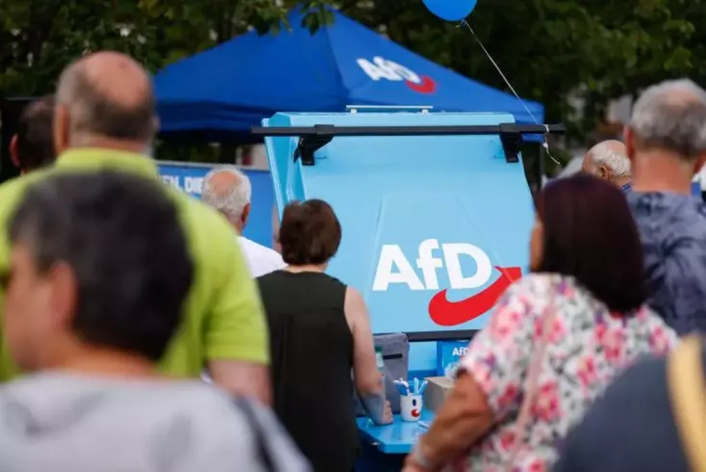 | Le logo du Parti d'extrême droite AfD sur un stand lors d'une réunion de campagne électorale à Weisswasser, en Saxe, en Allemagne, le 14 août. |