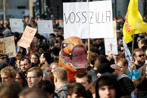 | Des manifestants défilent pour "sauver internet" et défendre le droit d'auteur, à Berlin le 23 mars. |