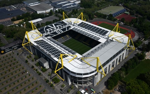 | Vue aérienne du stade du Borussia Dortmund, le Signal Iduna Park, prise le 8 mai 2020. |
