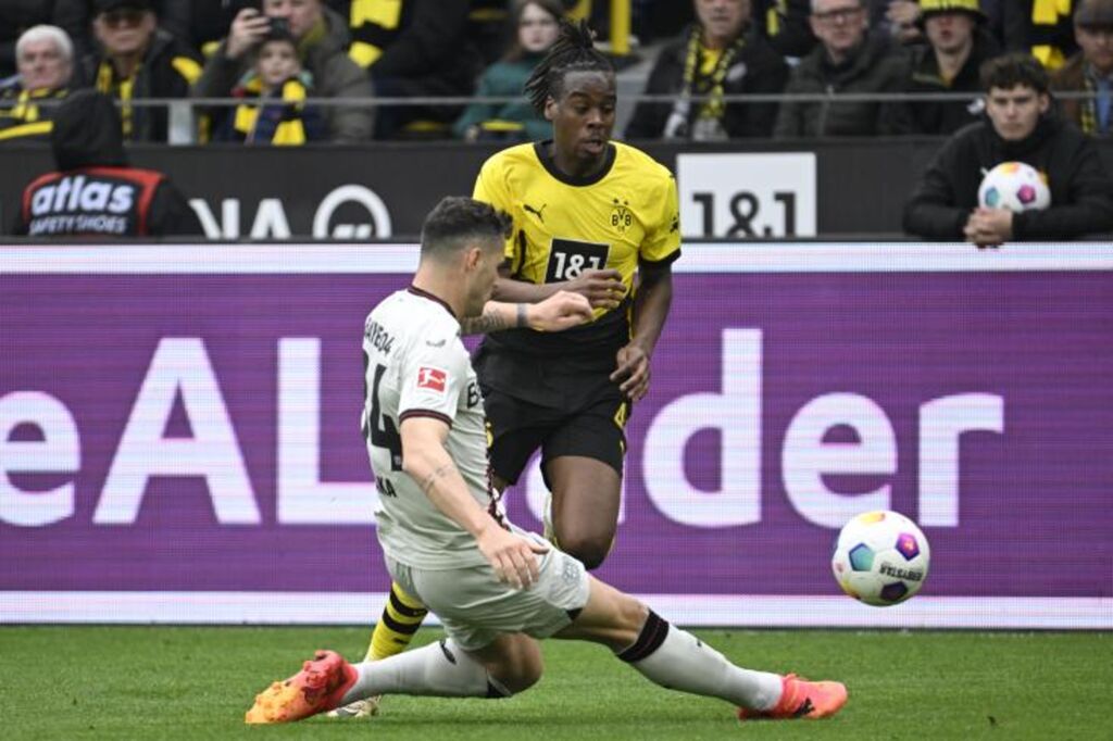 | Granit Xhaka, le milieu de terrain suisse du Bayer Leverkusen, tacle le ballon devant Jamie Bynoe-Gittens, l'attaquant anglais du Borussia Dortmund, en Bundesliga le 21 avril à Dortmund. |