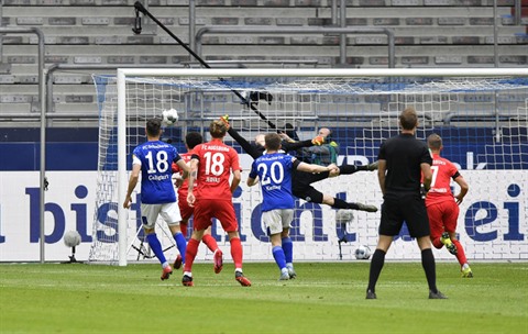 | Le gardien de Schalke ne peut arrêter le coup franc tiré par le milieu d'Augsbourg, Eduard Löwen, lors du match de Bundesliga à Gelsenkirchen, le 24 mai 2020. |
