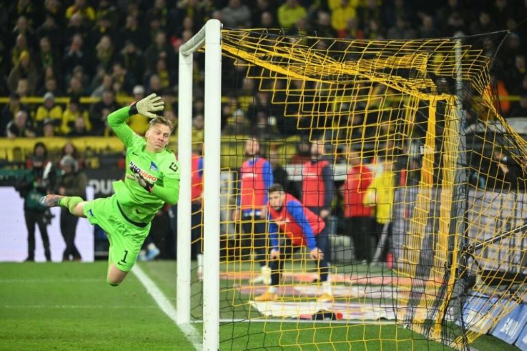 | Le gardien danois du Hertha Berlin, Oliver Christensen, impuissant sur le coup franc de Marco Reus à la 76e minute du match entre le Borussia Dortmund et le club berlinois le 19 février. |