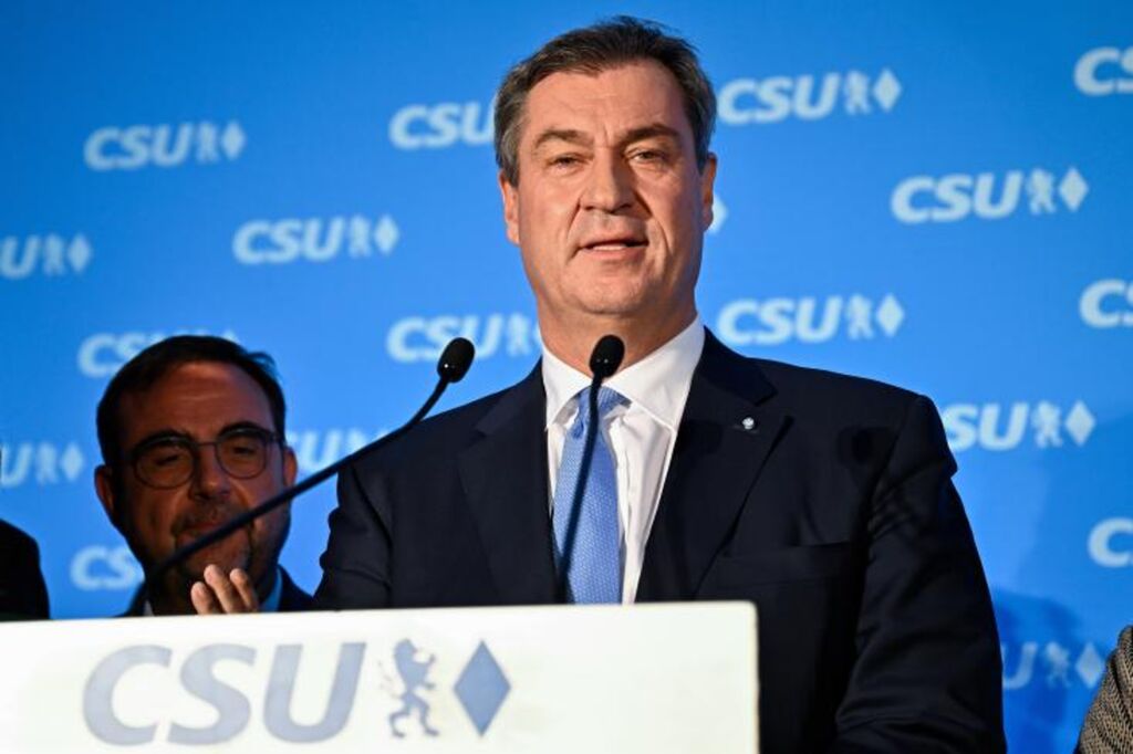 | Le chef du gouvernement de Bavière Markus Söder et candidat de la CSU aux élections régionales allemandes, fait une déclaration après les premiers résultats de sortie des urnes, le 8 octobre à Munich, dans le Sud de l'Allemagne. |