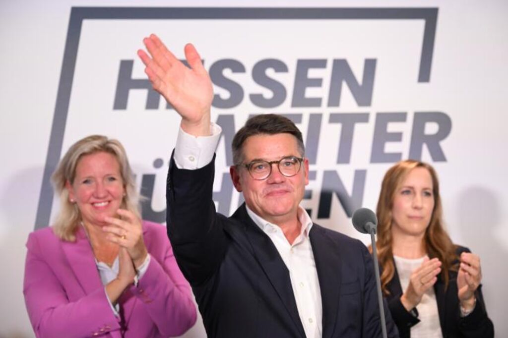 | Boris Rhein, candidat de la CDU aux élections régionales allemandes, salue ses partisans après les premiers résultats de sortie des urnes, le 8 octobre à Wiesbaden, en Hesse. |