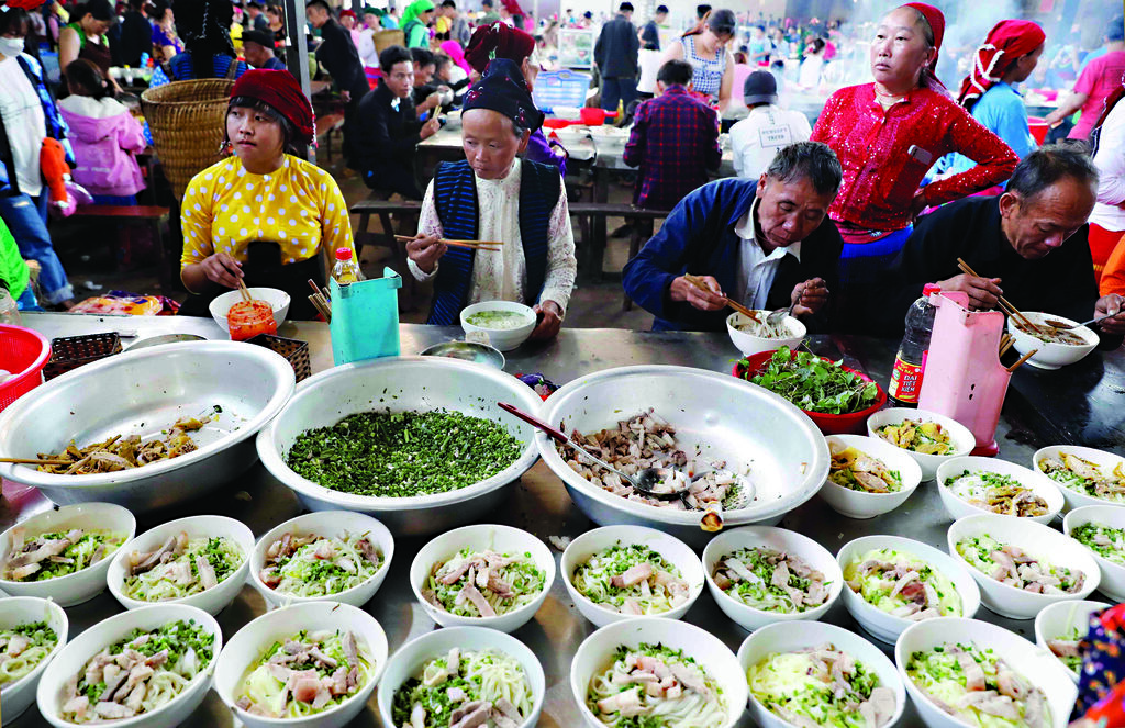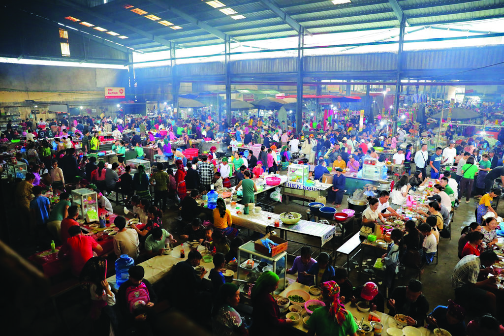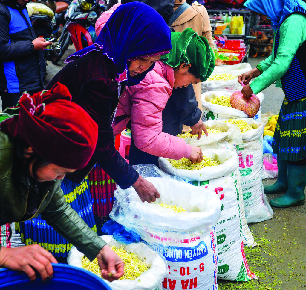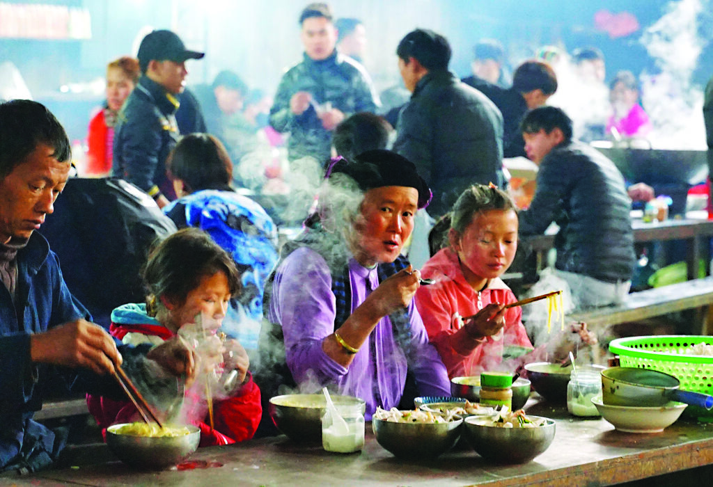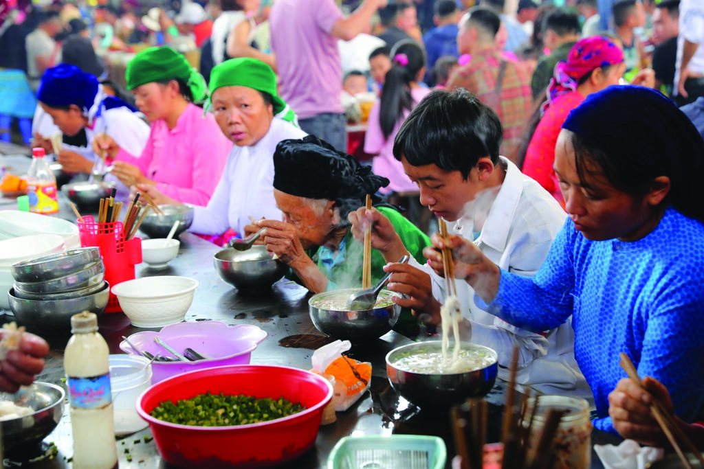 La zone réservée à la restauration est toujours bondée, avec des beignets à base de farine de riz ou de maïs, du thang cô (soupe d’entrailles de bovidés, typique des H’mông), ainsi que le classique pho (soupe de nouilles à la viande de bœuf ou de poulet), un plat familier pour tous les Vietnamiens, mais préparé avec des ingrédients locaux.