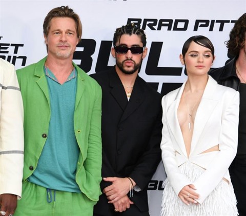 | De gauche à droite : les acteurs Brad Pitt, Bad Bunny et Joey King à l'avant-première de "Bullet Train" à Los Angeles, le 1er août. |