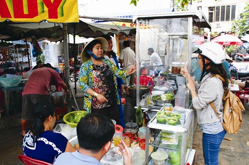 | Mme Thanh (au chapeau conique) gère sa petite gargote au 23, rue Hoàng Sa, dans le 1er arrondissement de Hô Chi Minh-Ville. |