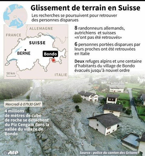 Une trentaine a également été hébergée dans le centre sanitaire de Bregaglia, juste en face de Bondo, a indiqué à l'AFP son directeur, Alain Vetterli. "Certains sont venus en voiture, d'autres en hélicoptère", a-t-il dit. Depuis, une quinzaine, essentiellement des touristes venus d'autres régions suisses sont repartis.
