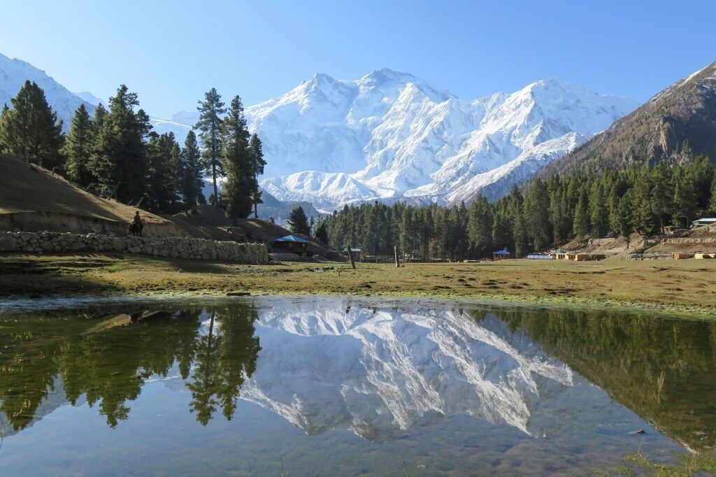 | Le sommet du Nanga Parbat se reflète dans un étang du village touristique de Fairy Meadows, au Pakistan, le 13 octobre 2019 |