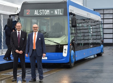 | Le président d'Alstom, Henri Poupart Lafarge, (gauche) avec David Journet (droite) directeur de NTL, une filiale d'Alstom, devant le bus Aptis 100% électrique le 9 mars. |