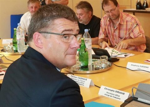 | Le secrétaire d'État à l'Industrie, Christophe Sirugue, avec des syndicalistes de l'usine Alstom de Belfort, à Paris le 13 septembre |