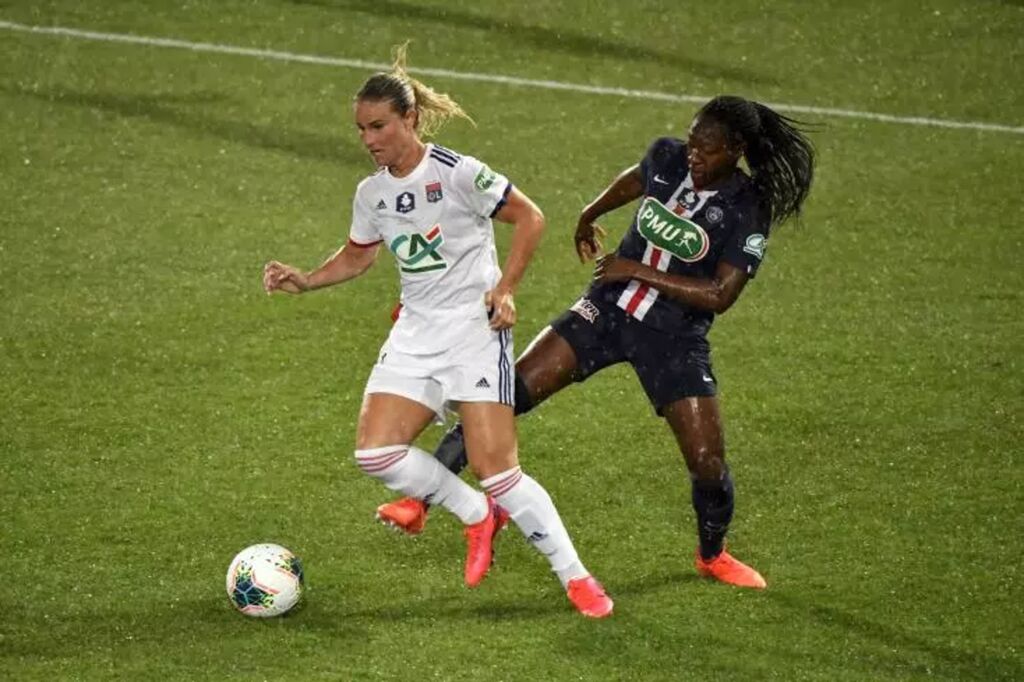 | La milieu de terrain de l'Olympique Lyonnais Amandine Henry (gauche) se bat pour le ballon avec la milieu de terrain du PSG Grace Geyoro lors de la finale de la Coupe de France entre l'Olympique Lyonnais et le Paris Saint-Germain à Auxerre. |
