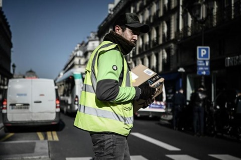 | Un livreur d'Amazon, le 19 mars à Paris. |