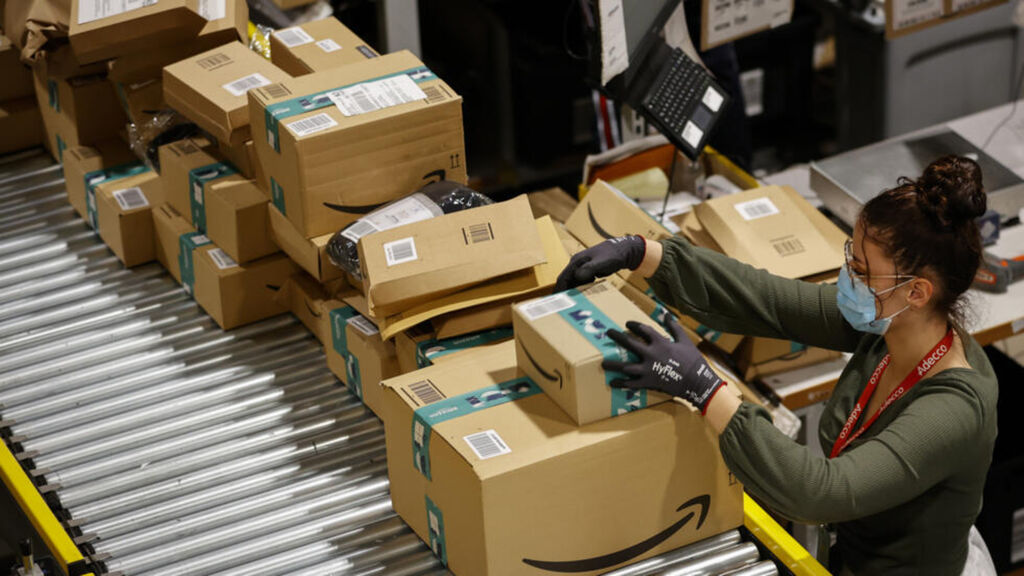 | Une employée travaille sur un site Amazon à Brétigny-sur-Orge, en Essonne (France). |