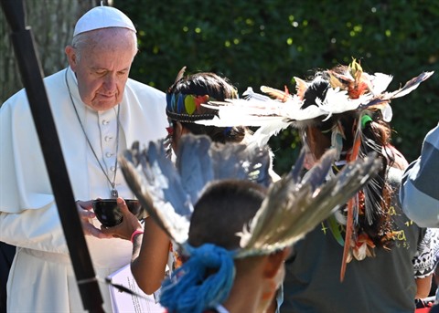 | Le pape François accueille des représentants des peuples indigènes d'Amazonie dans les jardins du Vatican. |
