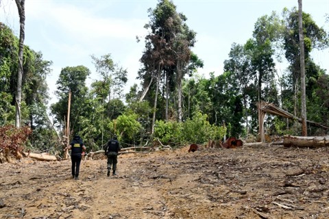 | Des responsables de l'État du Para inspectent une zone déboisée illégalement dans la forêt amazonienne, à Pacaja, le 22 septembre 2021 au Brésil. |