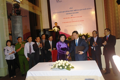 | Cérémonie de signature de la coopération dans la gestion du développement du tourisme entre le ministère de la Culture, des sports et du tourisme et Hô Chi Minh-Ville pour la période 2014-2020, le 10 septembre dans la mégapole du Sud. |
