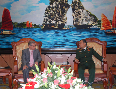 | Le général Truong Quang Khanh, vice-ministre vietnamien de la Défense (à droite) a reçu, le 9 avril à Hanoi, Andrey Petrov, vice-président de l'Académie des sciences de Russie. |